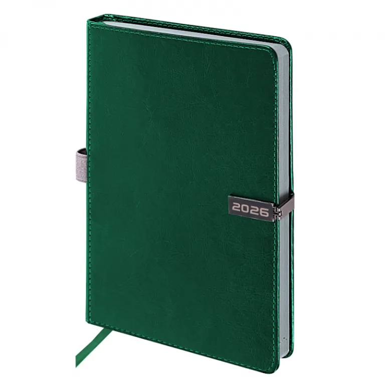 Твердая обложка стилизована под гладкую кожу темно-зеленого цвета. Материал обложки подходит для горячего тиснения. Для удобства пользования ежедневник снабжен держателем для ручки. Цветной срез в контраст обложки придает ежедневнику особый шарм. Дополнением является закладка-ляссе, с помощью которой при необходимости можно быстро открыть ежедневник на нужной странице. Ежедневник снабжен обширным справочным материалом. В конце есть 4 страницы для записей и заметок.