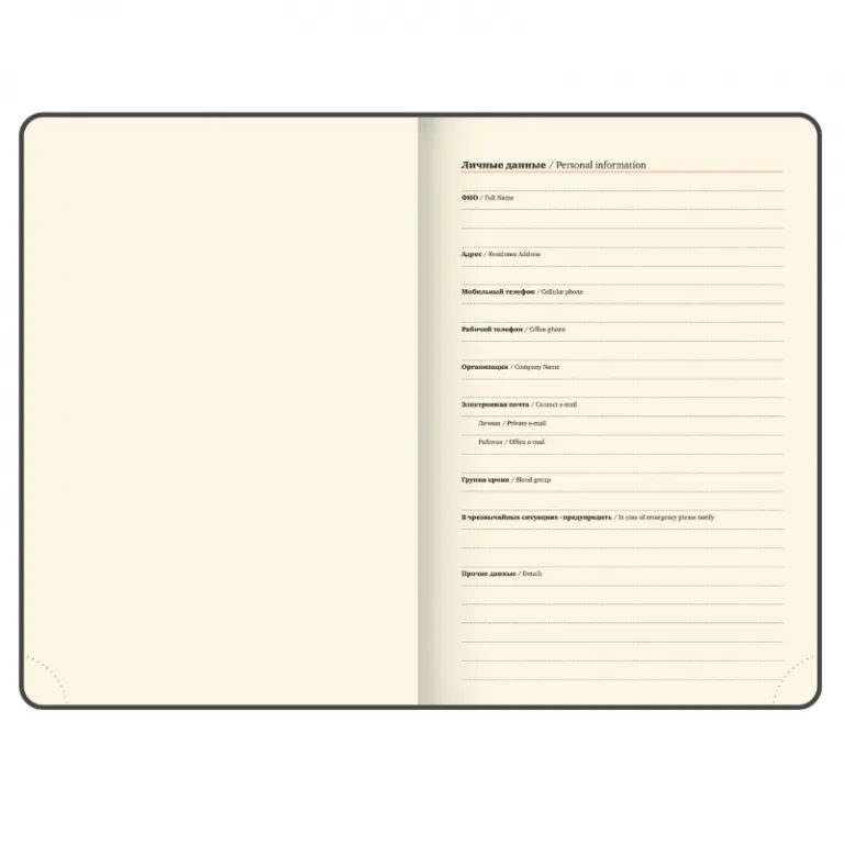 Внутренний блок включает 168 листов белой бумаги плотностью 70 г/м2. Каждая страничка имеет перфорированный угол. Благодаря стандартному формату А5 (138х213 мм) ежедневник удобно использовать как в офисе,