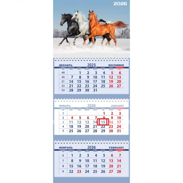 Календарь квартальный на 2026 г «Attomex. 3 Арабских скакуна» (295×700 мм) на 3-х пружинах, складной с курсором, кольцо пикколо, офсет 65 г/м², печать в 2 краски, обложка мелованный
