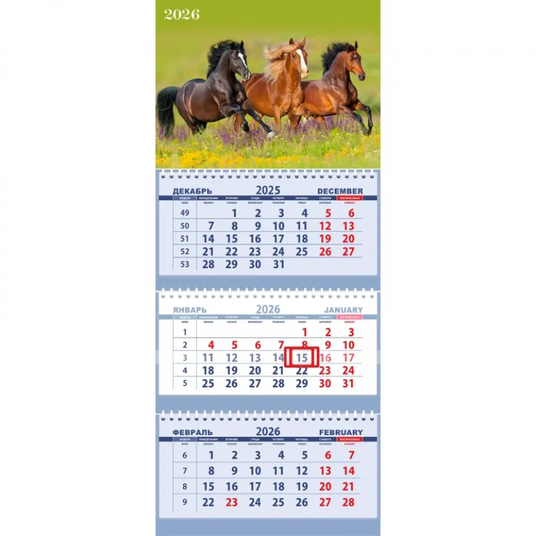 Календарь квартальный на 2026 г «Attomex. Галоп по цветочному лугу» (295×700 мм) на 3-х пружинах, складной с курсором, кольцо пикколо, офсет 65 г/м², печать в 2 краски,