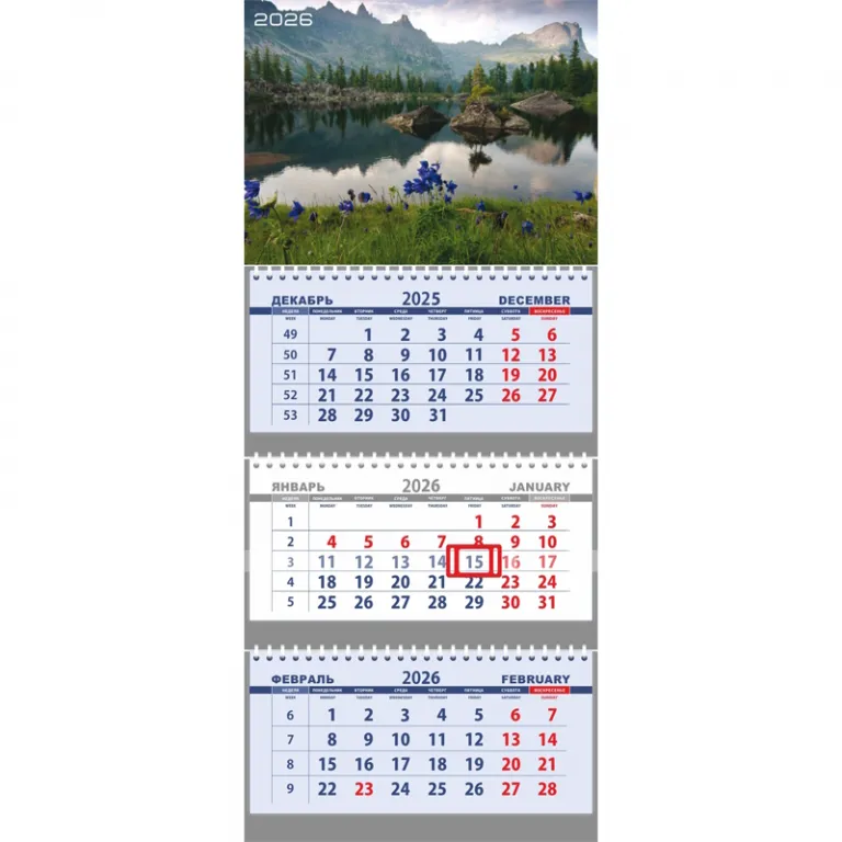 Календарь квартальный на 2026 г «Attomex. Горное озеро» (295×700 мм) на 3-х пружинах, складной с курсором, кольцо пикколо, офсет 65 г/м², печать в 2 краски, обложка