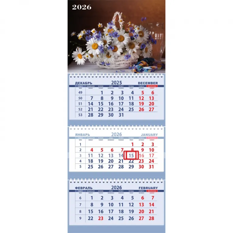 Календарь квартальный на 2026 г «Attomex. Ромашки» (295×700 мм) на 3-х пружинах, складной с курсором, кольцо пикколо, офсет 65 г/м², печать в 2 краски, обложка мелованный