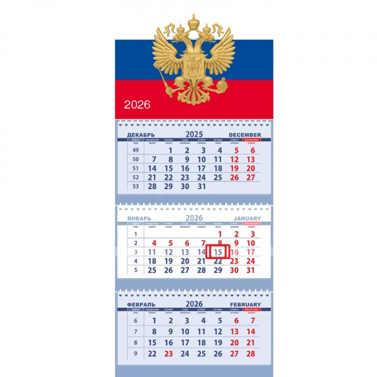 Календарь квартальный на 2026 г «Attomex. Триколор» (295×700 мм) на 3-х пружинах, складной с курсором, кольцо пикколо, офсет 65 г/м², печать в 2 краски,