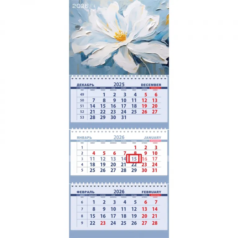 Календарь квартальный на 2026 г «Attomex. White flower» (295×700 мм) на 3-х пружинах, складной с курсором, кольцо пикколо, офсет 65 г/м², печать в 2 краски,