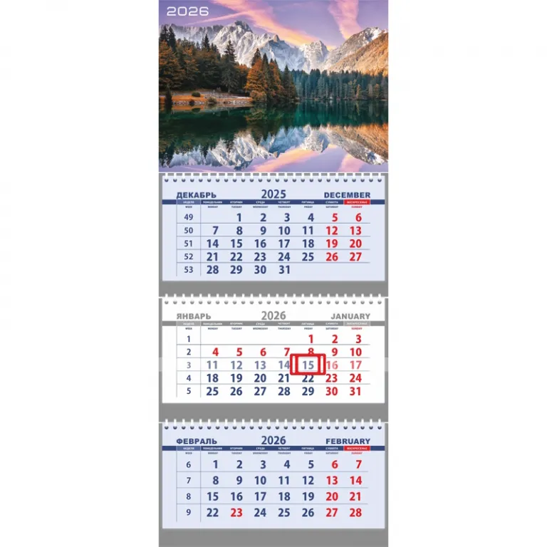 Календарь квартальный на 2026 г «Attomex. Закат в горах» (295×700 мм) на 3-х пружинах, складной с курсором, кольцо пикколо, офсет 65 г/м², печать в 2 краски, обложка