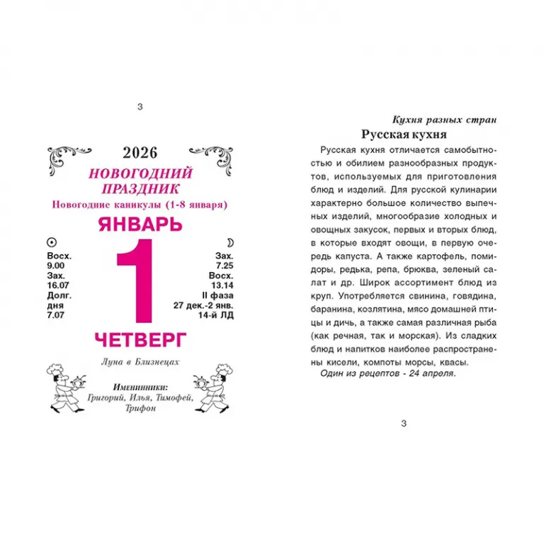 национальной кухни разных народов и другую полезную и любопытную информацию. Как и в любом отрывном календаре, на каждый день указаны моменты восхода и захода Солнца и Луны, фазы Луны, долгота