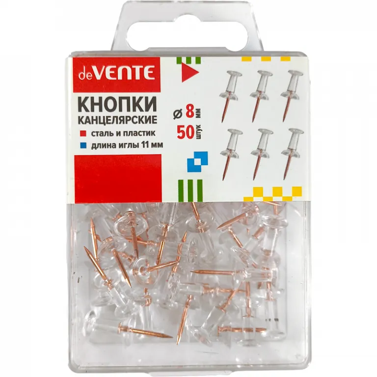 Кнопки канцелярские силовые «deVENTE» диаметр 8,3 мм, прозрачные, с иглой цвета розового золота, в форме гвоздика, 50 шт в пластиковой коробке