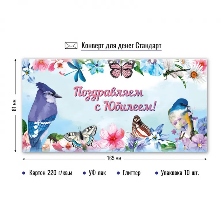 Конверты для денег стандарт формата 164×81 мм, материал: картон плотностью 210 г/кв.м. Обработка: УФ-лак, глиттер. Упакованы по 10 штук одного вида.