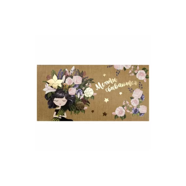 Конверт с надписью «ДЛЯ САМОЙ КРАСИВОЙ» изготовлен из высококачественного картона плотностью 215 г/м2. Выполнен в темных оттенках с золотистым принтом. Отделка — фольга. Размер — 166х82 мм.
