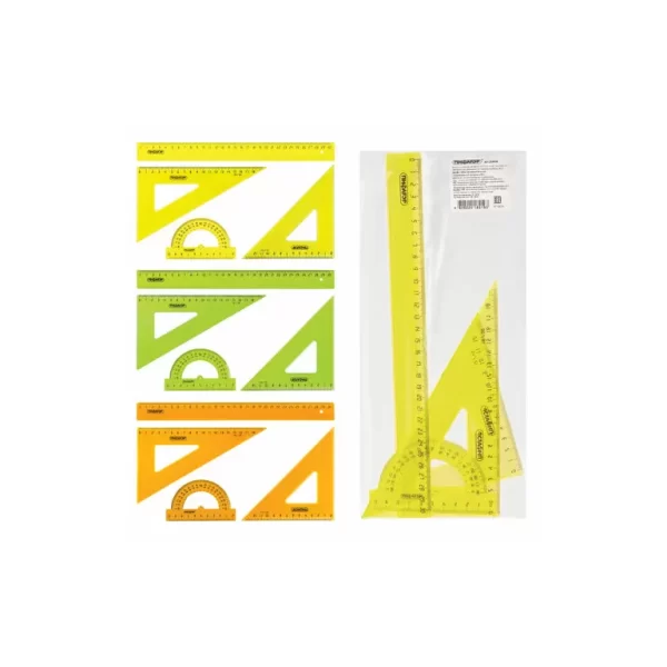Набор геометрический содержит: линейку — 20см треугольник — 9см, 45° треугольник — 13см, 30° транспортир — 10см, 180°. Все предметы изготовлены из полистирола. Яркие флуоресцентные полупрозрачные цвета. Упакованы в фирменную индивидуальную упаковку с европодвесом.