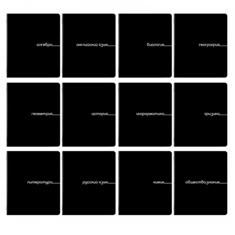 В комплекте 12 тетрадей: Алгебра, Английский язык, Биология, География, Геометрия, Обществознание, История, Информатика, Литература (в линию), Русский язык (в линию), Физика, Химия.