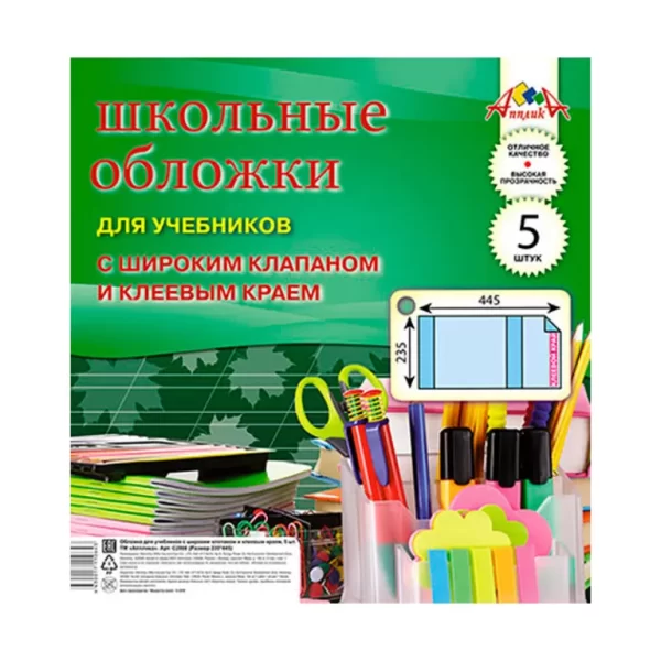 Обложки для тетрадей и дневника с широким клапаном и клеевым краем, набор 5 шт., ПВХ, толщина 110 мкм, размер 219 х 400 мм.
