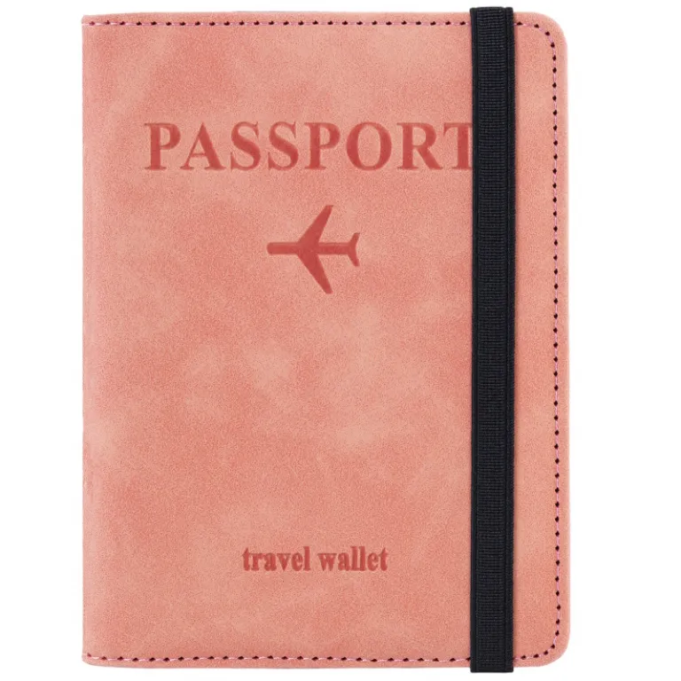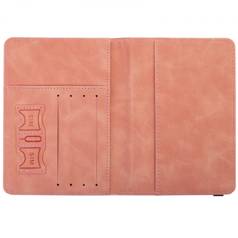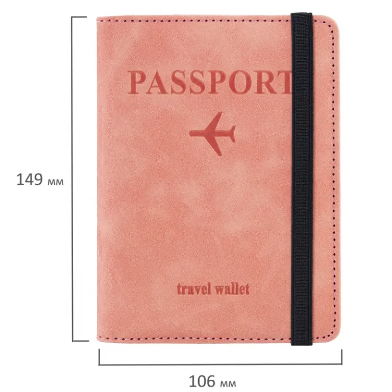 Модель выполнена из экокожи розового цвета c приятной на ощупь soft touch-поверхностью и украшена тиснением в виде надписи «Passport», «travel wallet» и силуэта самолета.