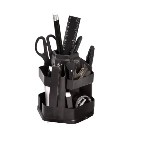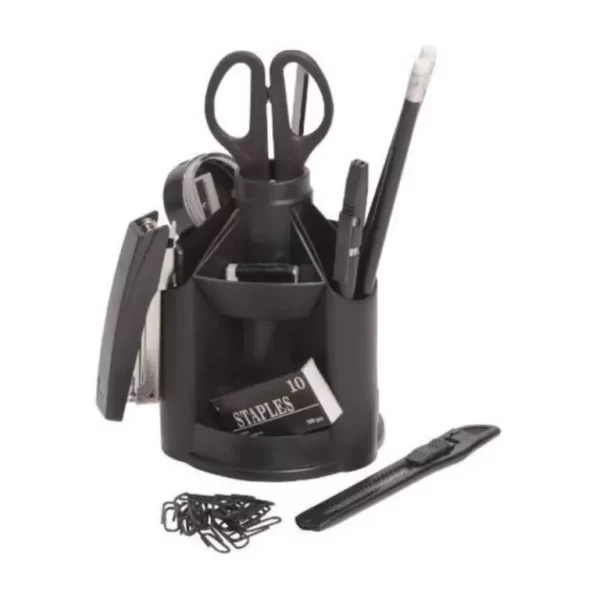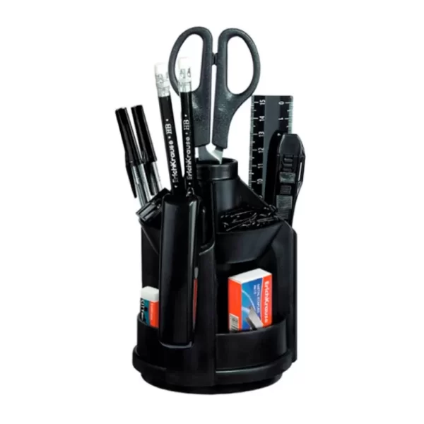 Готовый набор с наполнением. Устойчивая и вместительная подставка изготовлена из высококачественного пластика. В комплекте 9 предметов: 4 ручки, карандаш, линейка, ластик, 30 скрепок, ножницы. Наполнение может отличаться от представленного.