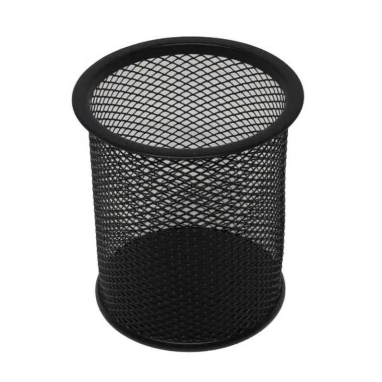 Изготовлен из высококачественной металической сетки черного цвета, имеет 1 большое отделение обтекаемой формы для письменных принадлежностей, диаметр 90мм.