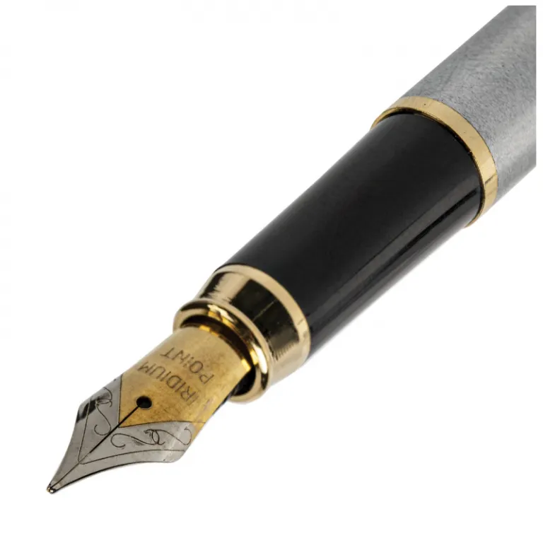 Стильная модель перьевой ручки с корпусом из металла серебристого цвета и золотистыми деталями.