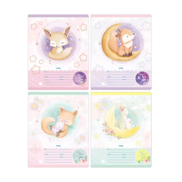 Внутренний блок: белая офсетная бумага плотностью 55 г/м2, линовка блока голубым цветом, поля красные, формат А5 (165х205 мм), 12 листов.