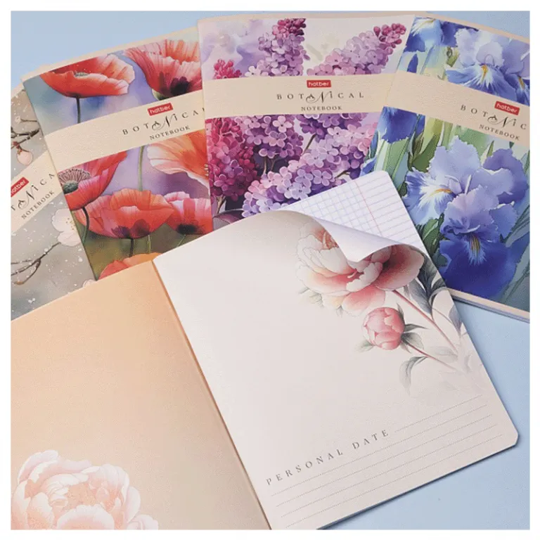 Серия тетрадей А5 формата (167х202мм) 48 листов5 дизайнов в блокеПлотность 60-65 гр.м, клетка, красные поля. Белизна 100% Вид крепления скоба. Тетрадь из серии «БОТАНИКА» с обложкой