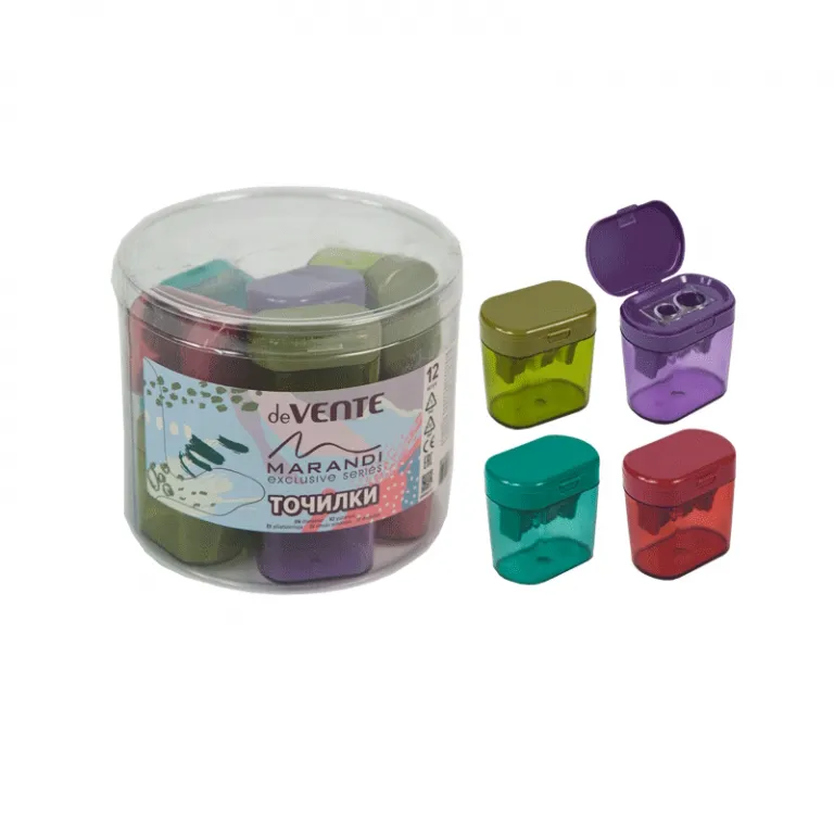 Точилка для карандашей «deVENTE. Marandi» 2 отверстия разных диаметров, с контейнером, пластмассовая, в пластиковой тубе, ассорти с индивидуальной маркировкой